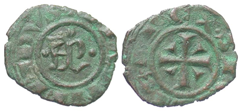 ITALY, Sicily. Manfred, 1258-1266 AD. Billon Denaro (0.64 gm) of Brindisi. APL monogram (Apulia) / Cross. MIR.326 (R). VF, green patina. Rare.