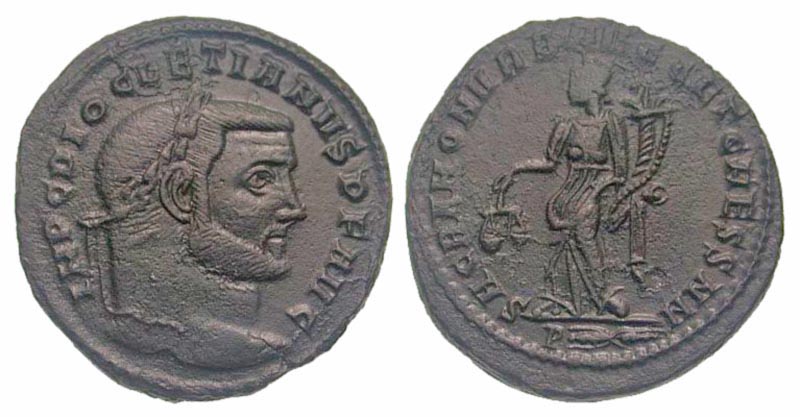 Diocletian. A.D. 284-305. AE follis (27.9 mm, 10.52 g, 6 h). Rome mint, Struck A.D. 300-301. IMP C DIOCLETIANVS P F AVG, laureate head right / SACRA MONET VRB AVGG ET CAESS NN, Moneta standing left, holding scales and cornucopia; P thunderbolt in exergue. RIC 100a. VF.