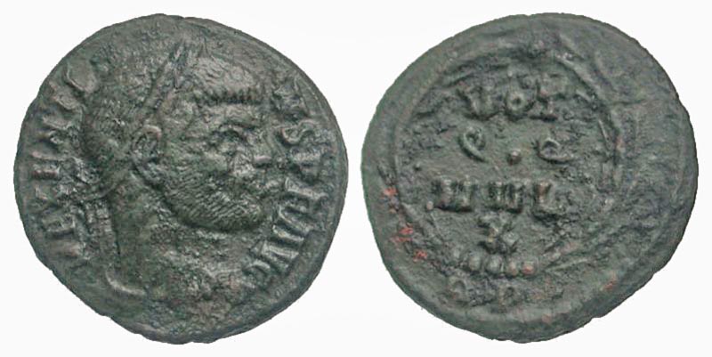 Maxentius. A.D. 306-312. AE quarter follis (16.0 mm, 1.89 g, 6 h). Rome mint, Struck A.D. 310-312. MAXENTIVS P F AVG, laureate head right / VOT/ Q·Q/ MVL/ X, legend in four lines within laurel wreath. RIC 281a. aVF. Scarce.