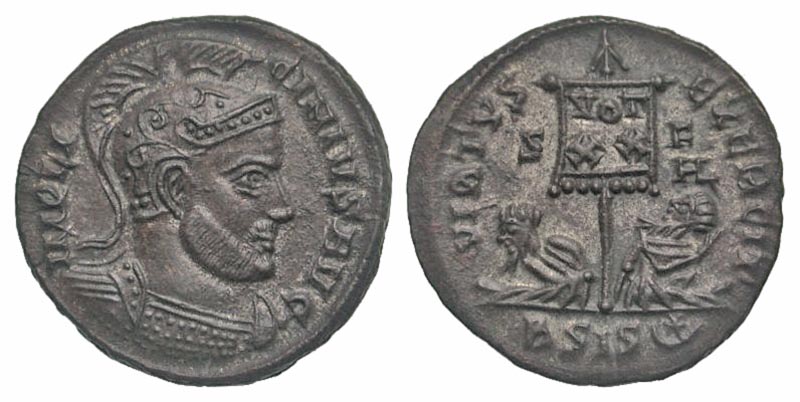 Licinius I. A.D. 308-324. AE follis (19.1 mm, 2.82 g, 1 h). Siscia mint, Struck A.D. 320. IMP LICINIVS AVG, helmeted and cuiarassed bust right / VIRTVS EXERCIT, two captives seated between banner with VOT XX; S-F/HL/BSIS dot over crescent in exergue. RIC 129. VF.
