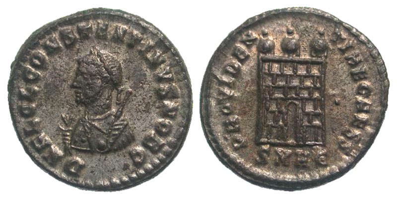 Constantine II. As Caesar, A.D. 317-337. AE follis (19.1 mm, 3.24 g, 11 h). Heraclea mint, Struck A.D. 317. DN FL CL CONSTANTINVS NOB C, laureate and draped bust left holding globe, scepter and mappa / PROVIDENTIAE CAESS, camp gate with two turrets and star above; pellet in right field, SMHЄ in exergue. RIC 32. gVF, fully silvered.