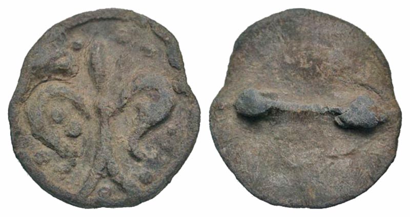 13th-14th century PB tessera or seal (16.4 mm, 2.21 g, 3 h). Magnesia mint ?. Fleur de lis / Spear or arrow. VF, sandy patina.