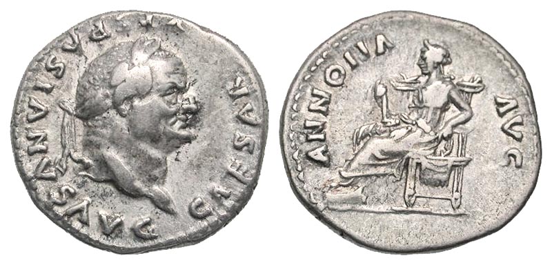 Vespasian. A.D. 69-79. AR denarius (18.4 mm, 3.49 g, 5 h). Rome mint, struck A.D. 77-78. CAESAR VESPASIANVS AVG, laureate head right / ANNONA AVG, Annona seated left, holding grain ears and resting left elbow on back of throne. RIC 131a; BMCRE 295; RSC 28. aVF.