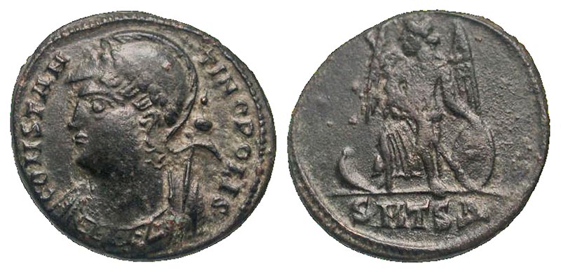 City Commemorative. A.D. 330-354. AE 3/4 (19.3 mm, 2.80 g, 11 h). Thessalonica mint, struckA.D. 330-331. CONSTANTINOPOLIS, laureate and helmeted bust of Constantinople left, wearing imperial cloak, scepter over shoulder / Victory standing left, foot on prow, holding scepter and resting hand on shield; SMTSĪ in exergue. RIC 188; LRBC 839. VF.