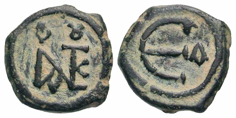 Justin II. 565-578. AE pentanummium (14.9 mm, 1.99 g, 6 h). Thessalonica mint. Monogram 8 of Justin II / Large Є, Δ to right. SBV 363; DOC 60a. VF.