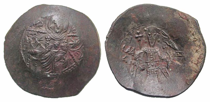 Isaac II Angelus. 1185-1195. BI trachy (26.5 mm, 4.79 g, 6 h). Constantinople mint. MP-ΘV, the Virgin Mary, enthroned facing, nimbate and wearing pallium and maphorium.She holds nimbate head of infant Christ before her / ICAAKIOC, ΔECΠOTHC, Isaac, standing facing, wearing crown, divitision, loros and sagion , and holding cruciform scepter and akakia, crowned by hand of God in upper right field. SBV 2003; DOC 3. VF.