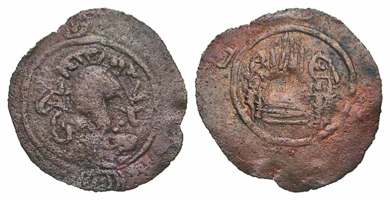 Arab-Sasanian. Khusraw type. Ca. 653-670. AE pashiz (19 mm, 0.53 g, 3 h). NM, but probably in Fars or Khuzestan, ND. Crowned Sasanian-style bust right, top ornament of crown Menorah-like / Fire altar between two attendants. Cf. Gyselen type 83. aVF, brown surfaces. Very rare.