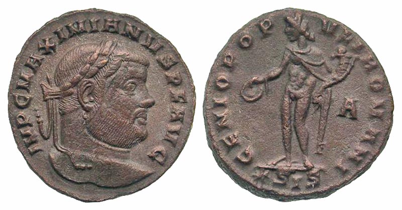 Maximianus. First reign, A.D. 286-305. AE follis (26.0 mm, 9.55 g, 6 h). Siscia mint, struck A.D. 295. IMP C MAXIMIANVS P F AVG, laureate head right / GENIO POPVLI ROMANI, Genius standing left, with modius on head, holding patera and cornucopia; A in right field, *SIS in exergue. RIC 85b. VF, light porosity.