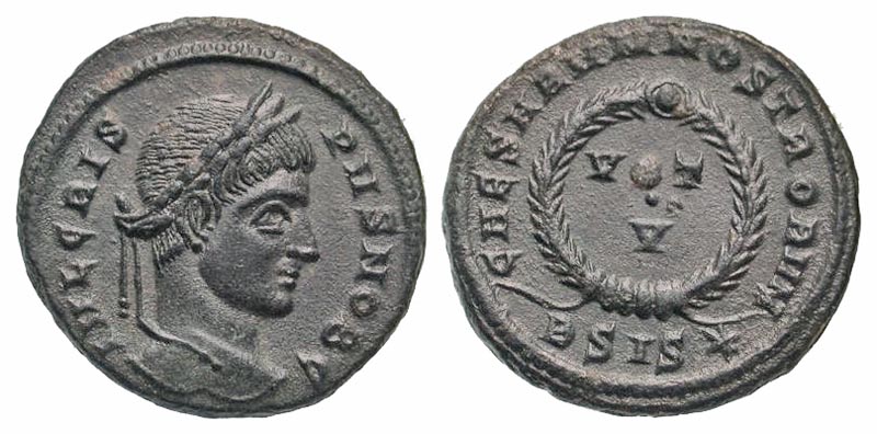 Crispus. Caesar, A.D. 317-326. AE 3 (19.0 mm, 3.54 g, 5 h). Siscia mint, struck A.D. 320-321. IVL CRISPVS NOB C, laureate head right / CAESARVM NOSTRORVM around VOT V within wreath; BSIS* in exergue. RIC 161. gVF.