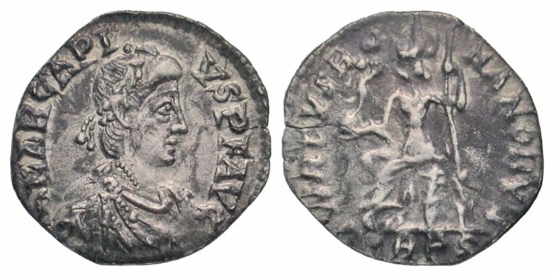 Arcadius. A.D. 383-408. AR siliqua (17.0 mm, 1.20 g, 12 h). Trier mint, struck A.D. 392-395. D N ARCADIVS P F AVG, pearl-diademed, draped, and cuirassed bust right / VIRTVS ROMANORVM, Roma seated left, holding Victory on a globe and spear; TRPS in exergue. RIC 106b; RSC 27e. Toned VF.