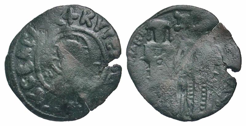 Andronicus II and Michael IX. 1295-1320. AE assaria (20.8 mm, 1.42 g, 5 h). Constantinople mint. ANΔPONIKOC MIXAHΛ, Andronicus and Michael standing facing, holding labarum between them / KVPIЄ CωCON T8C BACIΛЄIC, nimbate, facing bust of Christ. SBV 2436; DOC 6818-2. aVF, creased. Scarce.