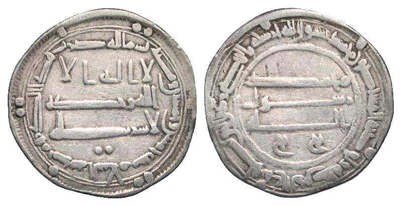 Lot 56-193. Abbasid Caliphate. al-Mansur. 136-158/754-775. AR dirham. Anonymous type. Madinat al-Salam (Baghdad) mint, dated A.H. 155.