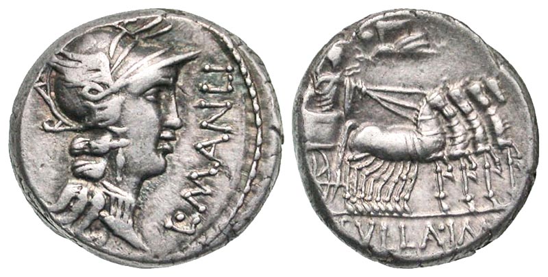 L. Manlius Torquatus and L. Cornelius Sulla. 82 B.C. AR denarius (15.9 mm, 3.96 g, 3 h). Military mint traveling with Sulla. PRO·Q, L·MANLI, helmeted head of Roma right / L·SVLLA·IM, Sulla driving triumphal quadriga right, holding branch, crowned by Victory flying left. Crawford 367/5; Sydenham 757; RSC Manlia 4. Toned VF. Ex D. Thomas collection.