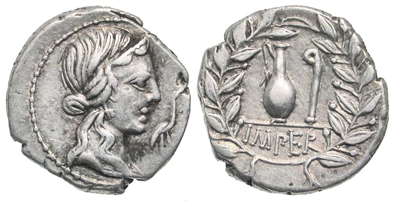 Q. Caecilius Q.f. L.n. Metellus Pius. 81 B.C. AR denarius (19.1 mm, 3.91 g, 9 h). North Italian mint. Diademed head of Pietas right; stork before / IMPER, jug and lituus within laurel wreath. Crawford 374/2; Sydenham 751; RSC Caecilia 44. gVF.