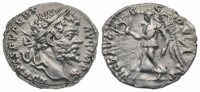 Septimius Severus. A.D. 193-211. AR denarius (17.3 mm, 3.32 g, 11 h). Rome mint, struck A.D. 197-198. L SEPT SEV PERT AVG IMP X, laureate head right / VICT AVGG COS II P P, Victory advancing left, holding wreath and palm branch. RIC 120c; RSC 694; BMCRE 258. gVF. Scarce.