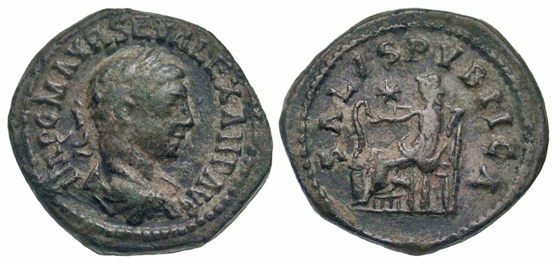 Severus Alexander. A.D. 222-235. AE limes denarius (21.3 mm, 3.88 g, 11 h). Illegal mint, imitating Antioch, struck ca. A.D. 222. IMP C M AVR SEV ALEXAND AVG, laureate, draped, and cuirassed bust right / SALVS PVBLICA, Salus seated left, feeding serpent from pataera, arising from altar left; star in upper left field. cf. RIC 298; BMCRE 1037; RSC 535c. Fine.