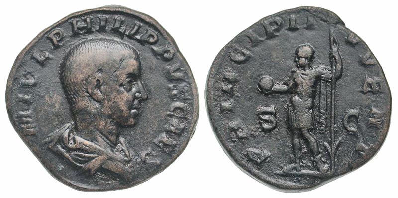 Lot 59-223. Philip II. As Caesar, A.D. 244-247. AE sestertius. Rome mint, struck A.D. 246.