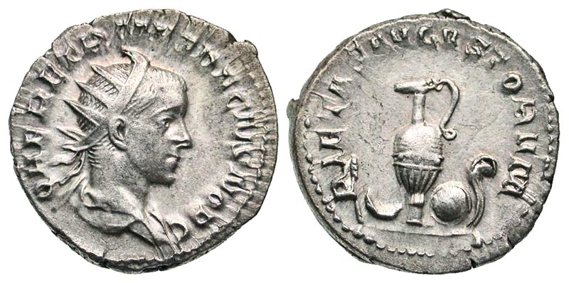 Herennius Etruscus. As Caesar, A.D. 250-251. AR antoninianus (21.5 mm, 3.42. g, 1 h). Rome mint, struck A.D. 251. Q HER ETR MES DECIVS NOB C, radiate and draped bust right / PIETAS AVGVSTORVM, whip, ladle, jug, patera and lituus. RIC 143; RSC 14. VF.