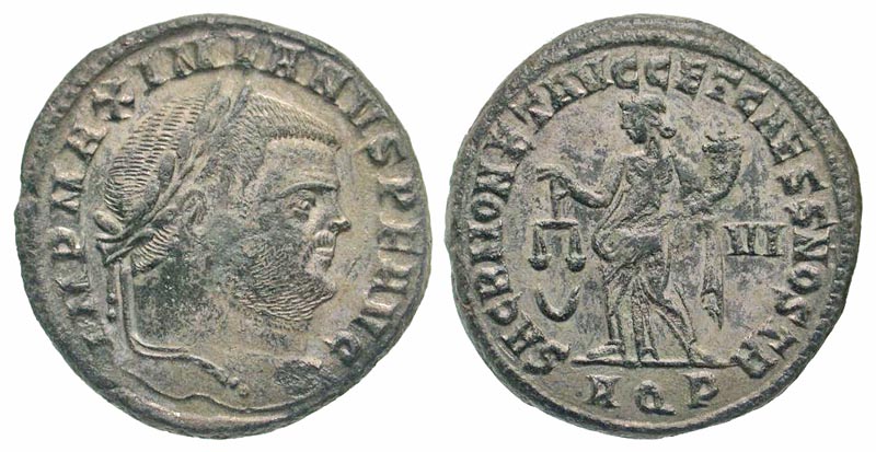 Maximianus. First reign, A.D. 286-305. AE follis (27.4 mm, 9.80 g, 7 h). Aquileia mint, struck A.D. 304-305. IMP MAXIMIANVS P F AVG, laureate head right / SACRA MONETA AVGG ET CAESS NOSTR, Moneta standing left, holding scales and cornucopia, crescent-VI in fields, AQP in exergue. RIC 39b. VF, silvered.