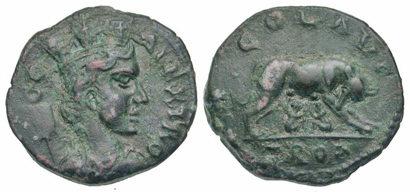 Troas, Alexandria Troas. Civic issue. Mid-late 3rd century A.D. AE 23 (23.0 mm, 5.85 g, 7 h). CO ALEX TRO, turreted and draped bust of Tyche right; vexillum behind / COL AVG TROA, she-wolf right, head left, suckling the twins Remus and Romulus. cf. Bellinger A495; SNG Copenhagen 104-7. VF.
