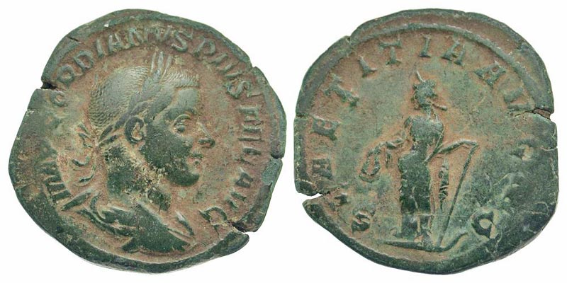 Gordian III. A.D. 238-244. AE sestertius (31.9 mm, 15.38 g, 11 h). Rome mint, struck A.D. 240. IMP GORDIANVS PIVS FEL AVG, laureate, draped and cuirassed bust right / LAETITIA AVG N, S-C, Laetitia standing left, holding wreath and anchor. RIC 300a. aVF, green patina, multiple small flan cracks.