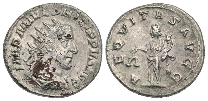 Philip I. A.D. 244-249. AR antoninianus (21.0 mm, 4.74 g, 6 h). Rome mint, struck A.D. 246. IMP M IVL PHILIPPVS AVG, radiate and cuirassed bust right / AEQVITAS AVGG, Aequitas standing left, holding scales and cornucopia. RIC 27b; RSC 9. VF, small red encrustations on the obverse.