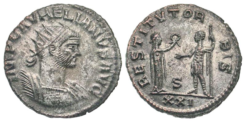 Aurelian. A.D. 270-275. AE antoninianus (21.5 mm, 3.65 g, 5 h). Antioch mint, struck A.D. 275. IMP C AVRELIANVS AVG, radiate and cuirassed bust right / RESTITVT ORBIS, female standing right, presenting wreath to Aurelian standing left, holding scepter; S in field, XXI in exergue. RIC 386. VF, fully silvered.