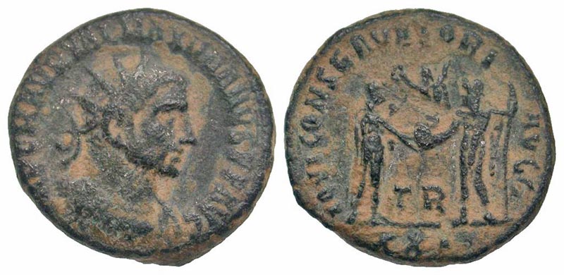 Maximianus. First reign, A.D. 286-305. AE antoninianus (20.5 mm, 4.26 g, 11 h). Tripolis mint, struck A.D. 285-290. IMP C M AVR VAL MAXIMIANVS P F AVG, radiate, draped and cuirassed bust right / IOVI CONSERVATORI AVGG, emperor standing right, holding scepter and receiving Victory on globe from Jupiter standing left, holding a scepter; TR between, XXI [branch] in exergue. RIC 625. aVF, black patina with orange earthen highlights.