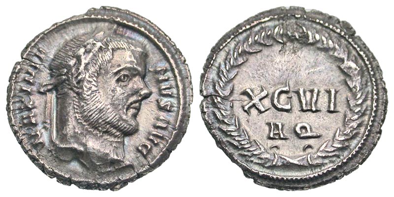 Maximianus. First reign, A.D. 286-305. AR argenteus (19.8 mm, 3.04 g, 5 h). Aquileia mint, struck A.D. 300. MAXIMIANVS AVG, laureate head right / XCVI, AQ, legend and mintmark within wreath. RIC 16b; RSC 697. gVF. XCVI (the number 96) was the quantity of coins issued per pound of silver.