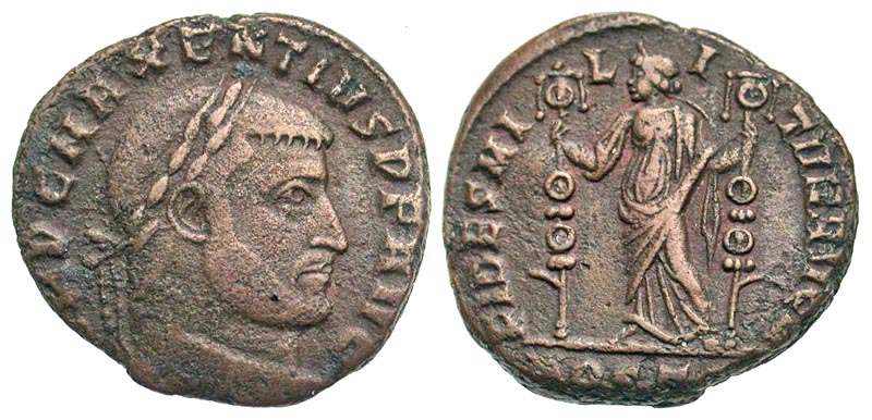 Lot 60-269. Maxentius. A.D. 306-312. AE follis. Ostia mint, struck A.D. 309-312. Ex George Spradling collection.