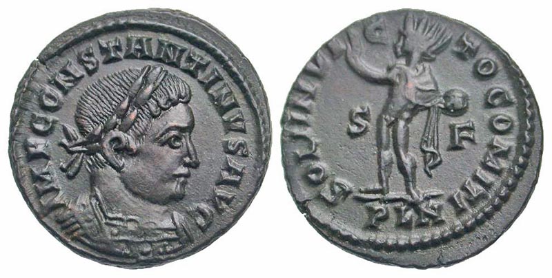 Constantine I. A.D. 307/10-337. AE follis (20.2 mm, 3.32 g, 7 h). London mint, struck A.D. 313-314. IMP CONSTANTINVS AVG, laureate and cuirassed bust right / SOLI INVICTO COMITI, Sol standing left, holding globe and raising right hand; S-F in fields, PLN in exergue. RIC 10. near EF, dark brown patina.