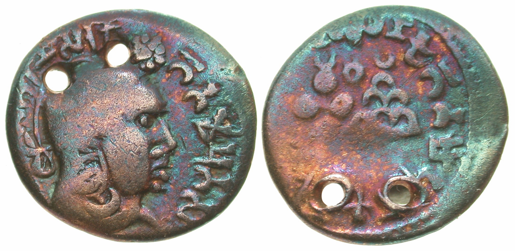 Andhra Region, Andhra (Satavahana) Dynasty. Yajna Sri Satakarni. A.D. 167-196. AR drachm (16 mm, 2.11 g, 4 h). King's bust right, with elaborate hairdo, Brahmi legend around: Rano Gotamiputasa Siri Yana Satakanisa / Ujjain symbol and six-arched hill, river below, Telugu legend: Arahanaku Gotami putaku Hiru Yana Hatakaniku. MAC 4966; MSI 156. VF, beautiful toning, holed. Extremely Rare.
