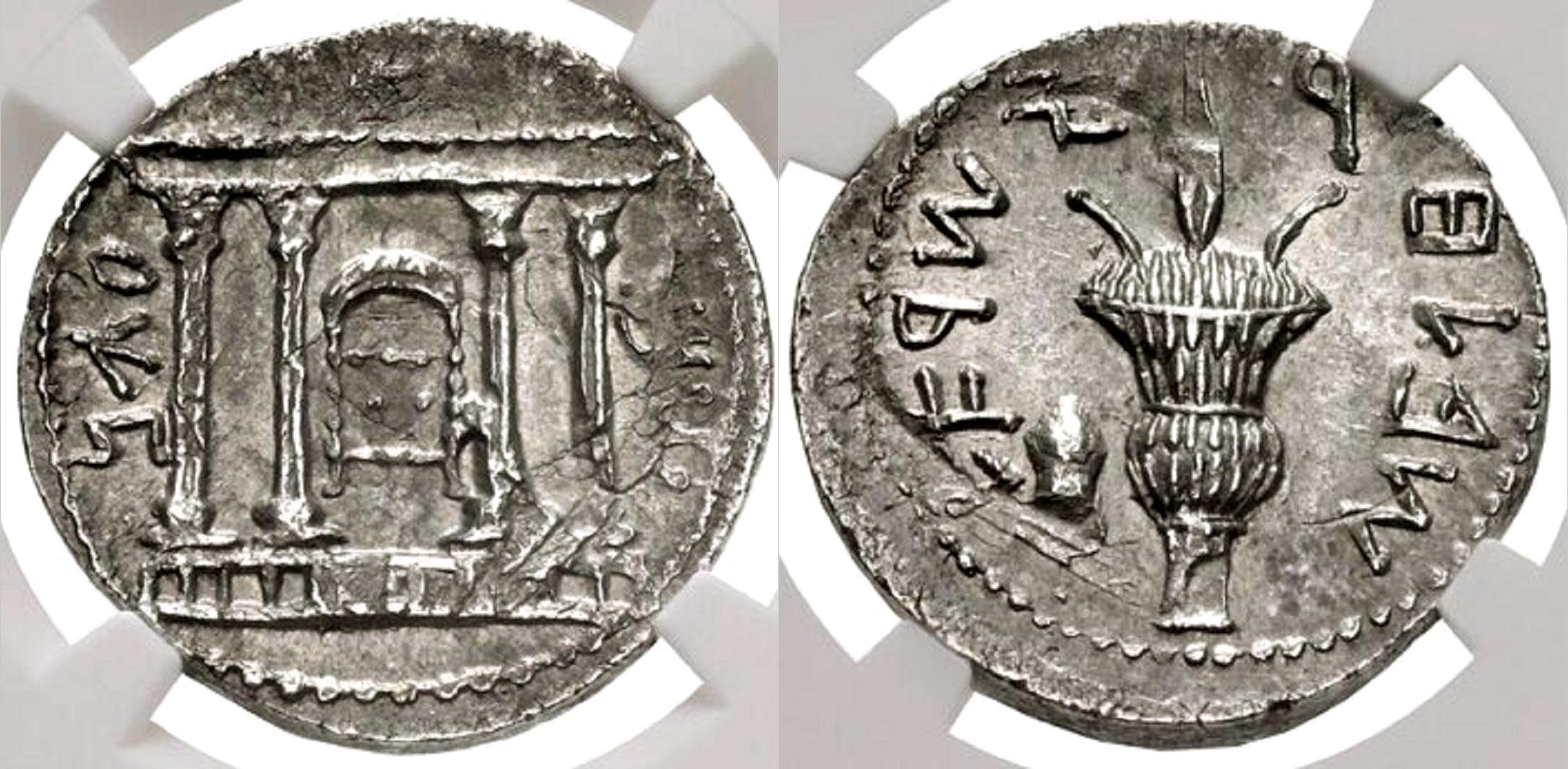 Lot 084. Judaea. Bar Kochba Revolt. 132-135 CE. AR sela. Jerusalem mint, Dated year 2 (67/8 CE). NGC certified MS. Ex David Hendin Collection.