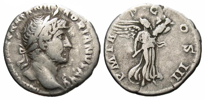 Hadrian. A.D. 117-138. AR denarius (18.0 mm, 2.60 g, 7 h). Rome, A.D. 123. IMP CAESAR TRAIAN HADRIANVS AVG, laureate head right / P M TR P COS III, Victory flying right, holding trophy. RIC 101; RSC 1132; BMCRE 215. aVF, scarce.