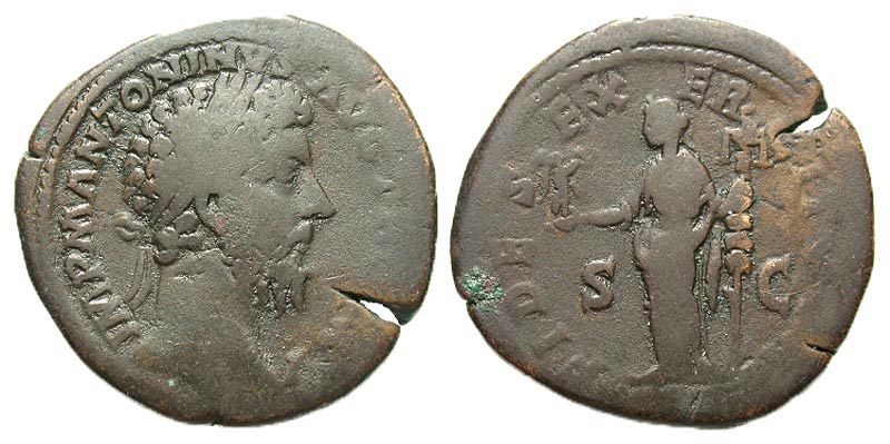 Marcus Aurelius. A.D. 161-180. Æ sestertius (33.0 mm, 20.52 g, 6 h). Rome, A.D. 171. IMP ANTONINVS AVG TR P XXV, laureate head right / FIDES EXERCITVM, S-C, Fides standing left, holding Victory and a legionary standard. RIC 998. aVF, flan crack.