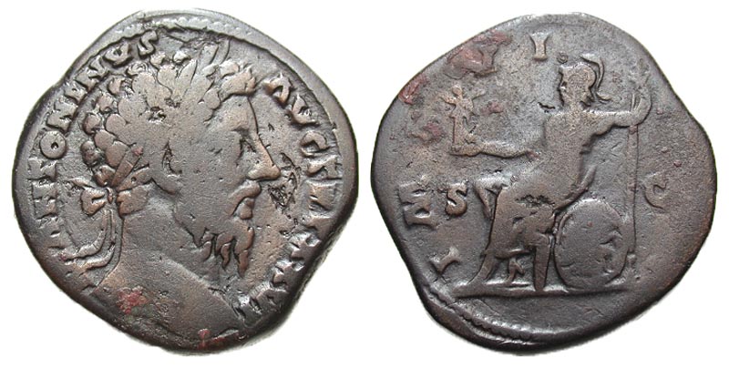 Marcus Aurelius. A.D. 161-180. Æ sestertius (32.0 mm, 28.42 g, 11 h). Rome, A.D. 171-172. M ANTONINVS AVG TR P XXVI, laureate head right / IMP VI COS III, SC, Roma seated left, holding Victory and spear; shield at her side. Shield decorated with head of Medusa. RIC 1033; BMCRE 1417. aVF, some slight pitting, patches of red encrustations.