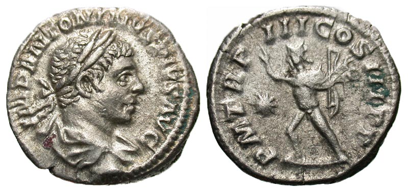 Elagabalus. A.D. 218-222. AR denarius (18.6 mm, 2.97 g, 7 h). Rome, A.D. 220. IMP ANTONINVS PIVS AVG, lauteate head right / P M TR P III COS III P P, Sol advancing left, holding whip and raising right hand, star in left field. RIC 28; RSC 154; BMCRE 179. aVF.