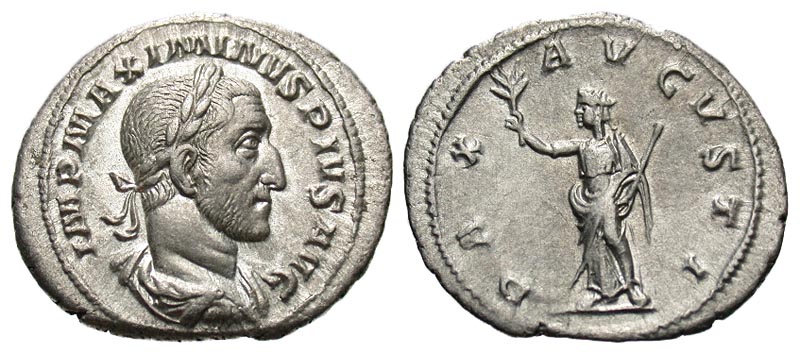 Maximinus I 'Thrax'. A.D. 235-238. AR denarius (21.2 mm, 2.82 g, 12 h). Rome, A.D. 236. IMP MAXIMINVS PIVS AVG, laureate, draped and cuirassed bust right / PAX AVGVSTI, Pax standing left, holding olive branch and transverse scepter. RIC 12; BMCRE 68-9; RSC 31a. gVF.
