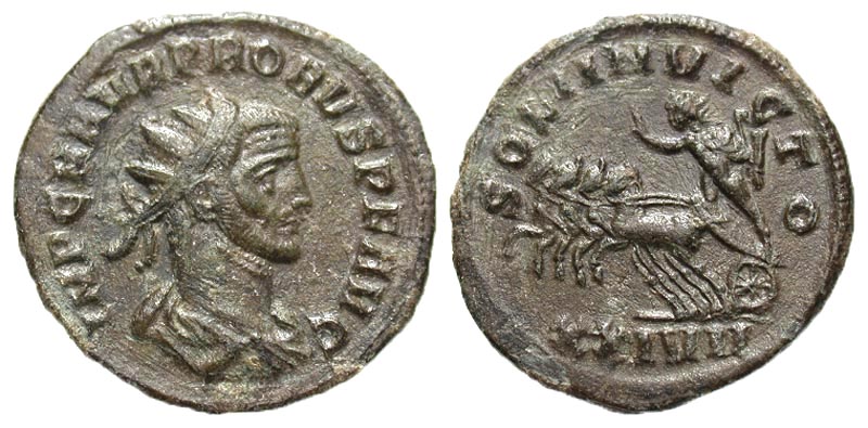 Probus. A.D. 276-282. AR antoninianus (22.1 mm, 3.84 g, 7 h). Siscia, A.D. 280. IMP CM AVR PROBVS P F AVG, radiate, draped, and cuirassed bust right / SOLI INVICTO, Sol driving quadriga left, holding whip and raising right hand; XXIVII in exergue. RIC 767; Alföldi 76, n° 158. aVF.