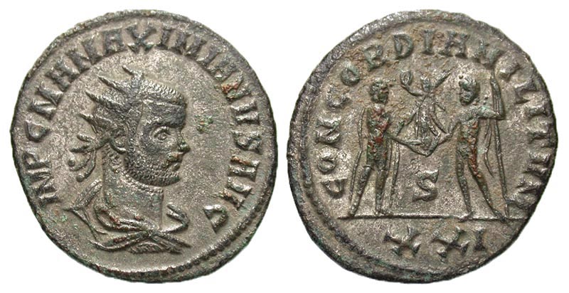 Maximianus. First reign, A.D. 286-305. Æ antoninianus (23.2 mm, 3.65 g, 0 h). Cyzicus, A.D. 293. IMP C M A MAXIMIANVS AVG, radiate and draped bust right / CONCORIDA MILITVM, Maximianus standing right holding scepter, receiving Victory on globe from Jupiter; S/XXI in exergue. RIC 607. VF, silvered.