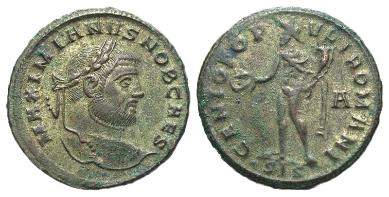 Galerius. As Caesar, A.D. 293-305. Æ Follis (27.7 mm, 9.92 g, 7 h). Siscia, A.D. 295. MAXIMIANVS NOB CAES, laureate head right / GENIO POVLI ROMANI, Genius standing left, wearing modius and chlamys over shoulder, holding patera and cornucopia; A in right field, SIS in exergue. RIC 90. aVF, Green highlights, some silvering remains.