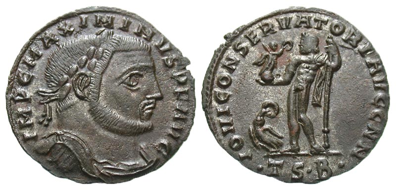 Maximinus II Daza. A.D. 309-313. Æ Follis (22.9 mm, 2.44 g, 0 h). Thessalonica, A.D. 312-313. IMP C MAXIMINVS P F AVG, laureate, draped, and cuirassed bust right / IOVI CONSERVATORI AVGG NN, Jupiter standing facing, head left, chlamys draped from shoulder, holding Nike and scepter, eagle with wreath at his feet; ·TS·B· in exergue. RIC 61a. gVF.