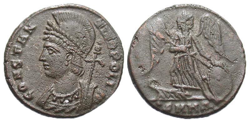 Commemorative Series. A.D. 330-354. Æ 3 (17.6 mm, 2.95 g, 11 h). Heraclea, A.D. 330-333. CONSTANTINOPLI, helmeted and laureate bust of Constantinopolis left / Victory standing left on prow, holding transverse spear and shield, SMHΔ in exergue. RIC 115; LRBC 903. VF.