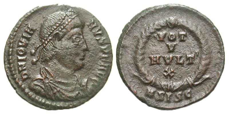 Jovian. A.D. 363-364. Æ 3 (20.8 mm, 3.38 g, 6 h). Siscia. D N IOVIANVS PF AVG, pearl-diademed, draped and cuirassed bust right / VOT V MVLT X, within wreath; BSISC in exergue. RIC 426; LRBC 1267. gVF.