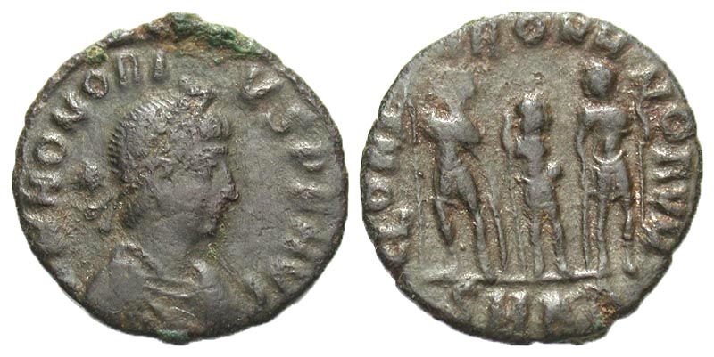 Honorius. A.D. 393-423. Æ 4 (15.1 mm, 1.56 g, 7 h). Cyzicus, A.D. 406-408. D N HONORIVS P F AVG, pearl-diademed, draped and cuirassed bust right / GLORIA ROMANORVM, three emperors (Arcadius, Honorius & Theodosius II) standing, the outer two holding spears; SMKB in exergue. RIC 149; LRBC 2802. aVF.