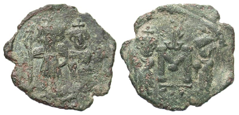 Constans II. 641-668. Æ follis (24.3 mm, 3.45 g, 6 h). Syracuse, 659-668. Constans with long beard, crowned and in military dress, holding long cross, and Constantine IV, unbearded and crowned, on right, holding holding globus cruciger / Large M, Heraclius, crowned, wearing chlamys, standing on left, holding cross on globe, TKw monogram above, Tiberius, crowned, wearing chlamys, standing on right, holding globus cruciger. SBV 1110; DOC 181. Fine.