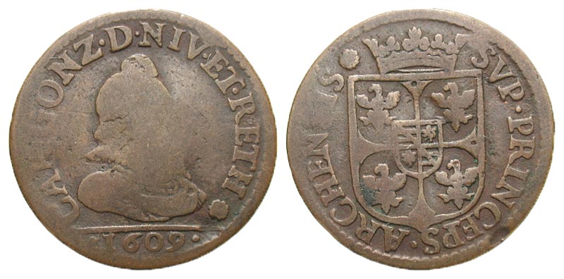 France, Feudal. Nevers & Rethel. Charles of Gonzaga. 1601-1637. CU liard (25.0 mm, 3.75 g, 6 h). CAR GONZ D NIV ET RETH / 1609, bust right / SVP PRINCEPS ARCHENSIS, crowned shield. Bd 1806; KM 12.1. Fine.