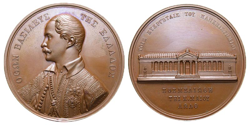 Greece. King Othon. 1816-1857, King 1833-1862. 44.1 mm, 43.53 g, 12 h). 1837. OΘΩN BAΣIΛEYΣ THΣ EΛΛAΔOΣ, bust left in national dress / TOIΣ EYEPΓETAIΣ TOY ΠANEΠIΣTHMIOY / EΘEMEΛIΩΘH THI K.MAIOY AΩΛΘ, university facade. EF, minor field marks.