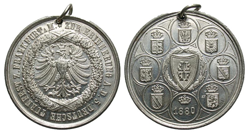 Germany, Frankfurt. 1880. AR medal (39.6 mm, 20.30 g, 12 h). Eight shields, crown over 1880 below / DEUTSCHE TURNFEST Z FRANKFURT M ZUR ERINNERUNG A.D. 5, crowned eagle within wreath. Proof-like AU, holed, loop.