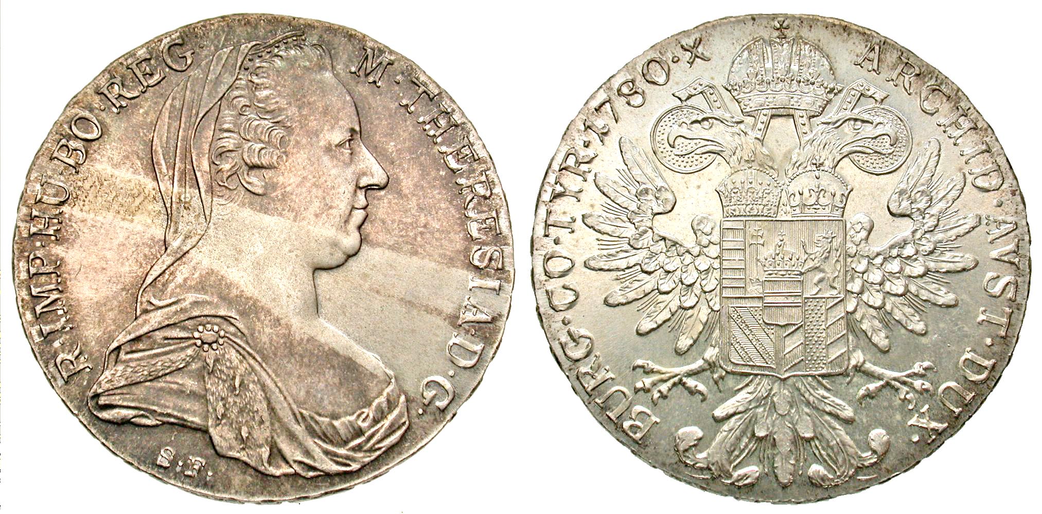 Austria. Maria Theresa. 1743-1780. AR thaler (40.6 mm, 28.09 g, 12 h). probable restrike. "dated" 1780. M · THERESIA · D · G · R · IMP · HU · BO · REG , veiled and draped bust of Maria Theresa right, brooch on shoulder; S.F. (engraver's initials) beneath bust / ARCHID · AVST · DUX · BURG · CO · TYR · 1780 · X, crowned Austro-Hungarian Imperial eagle facing, wings spread, double-crowned arms on breast . Cf. KM 1866.3. MS, some brownish toning on areas of obverse; reverse bright with very light toning.